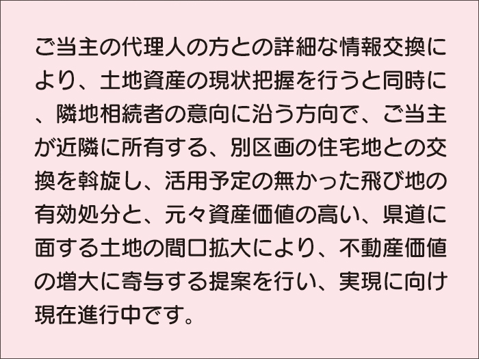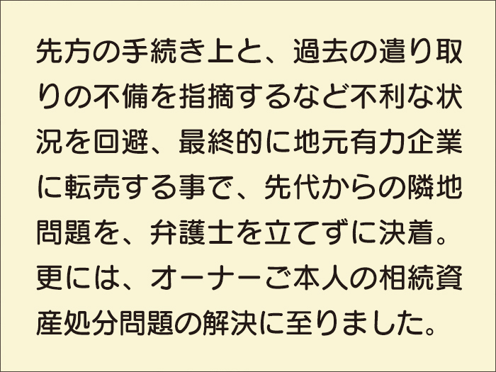 静岡県に代々続く商売を続ける16代目当主が所有する土地を処分するにあたり、先先代以来隣地所有者とのトラブル経緯があるため、県道に面する境界標石確認に際して、立会いを要する機会を捉え、隣地所有者が高齢化による世代交代時期を迎えている状況もあり、子息の住居用として、県道から離れた奥側の部分との換地の申し入れがあり、その対応方法に関する相談を受けました。