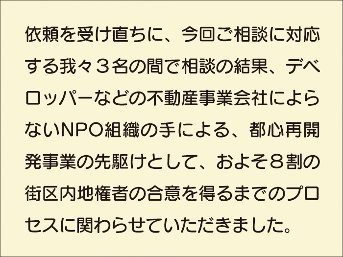 名古屋都心部居住の不動産オーナーからのご相談があり、所有地を含む、道路(公道)で囲まれた街区全体の再開発に向けた取り組みに協力できないかとの依頼を受けました。 こちらのオーナーとの関係は、以前同地域の隣接エリアで、当NPOのメンバーが、まちづくりに関する勉強会を立上げ、まちづくり協議会結成へと進むプロセスに、地元の主要メンバーとして関わっておられた事から、その考え方と行動原理を相互に知る事となっていました。