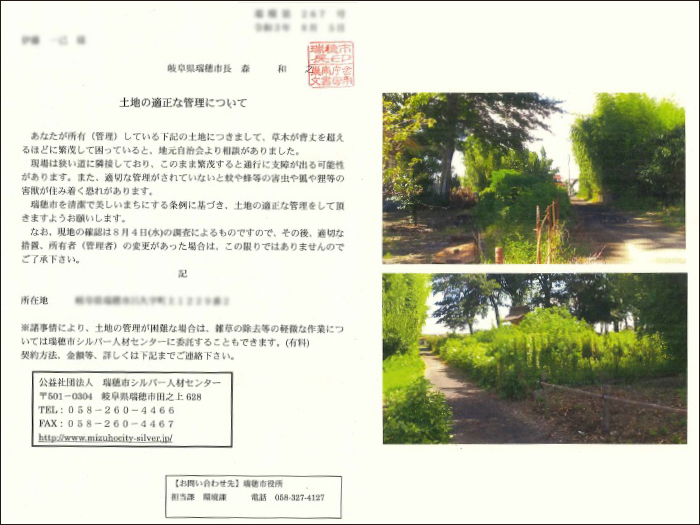 ◉岐阜県の河川沿いに400坪の土地をもっている 名古屋市内在住の土地所有者が、瑞穂市から 「適正な管理」を要請された。 ◉息子と二人で草刈りに出かけたが、息子から「いつ まで手間暇かけて草刈りするの?」、と。 ◉さて、借り手はあるか、買い手はあるか、 測量図面はあるが権利証は見当たらない。 地目は何かな。